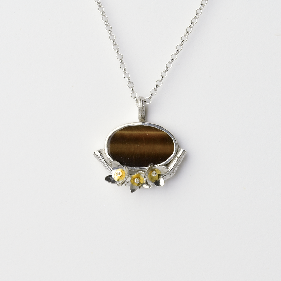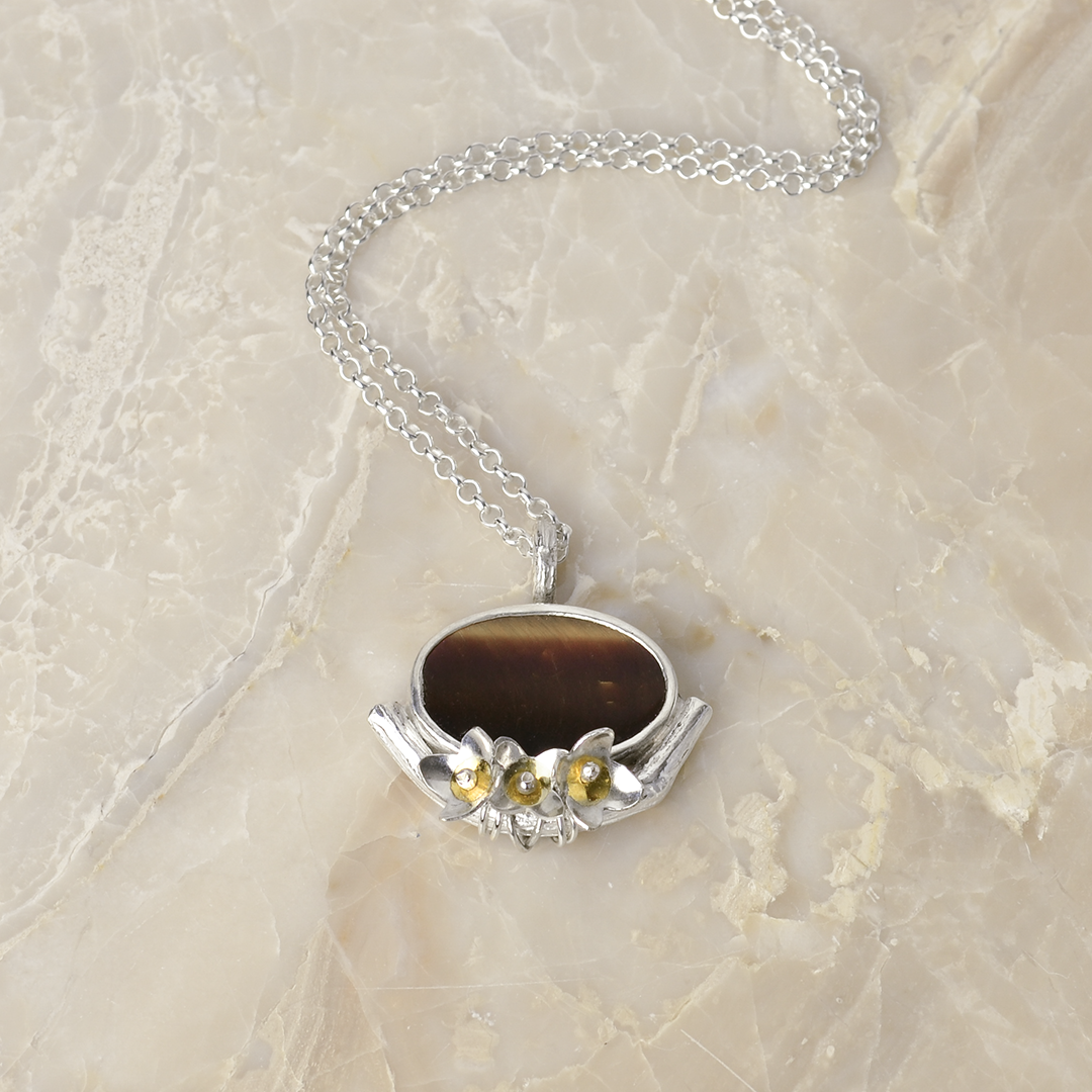 This Sterling Silver Olive Blossom & Tiger Eye Christian Necklace will take you to a place of peace with every glance in the mirror. The pendant includes hand formed sterling silver olive blossoms with 24kt gold centers. The tiger eye cabochon is the perfect centerpiece for this design, having a pattern similar to olive wood.
