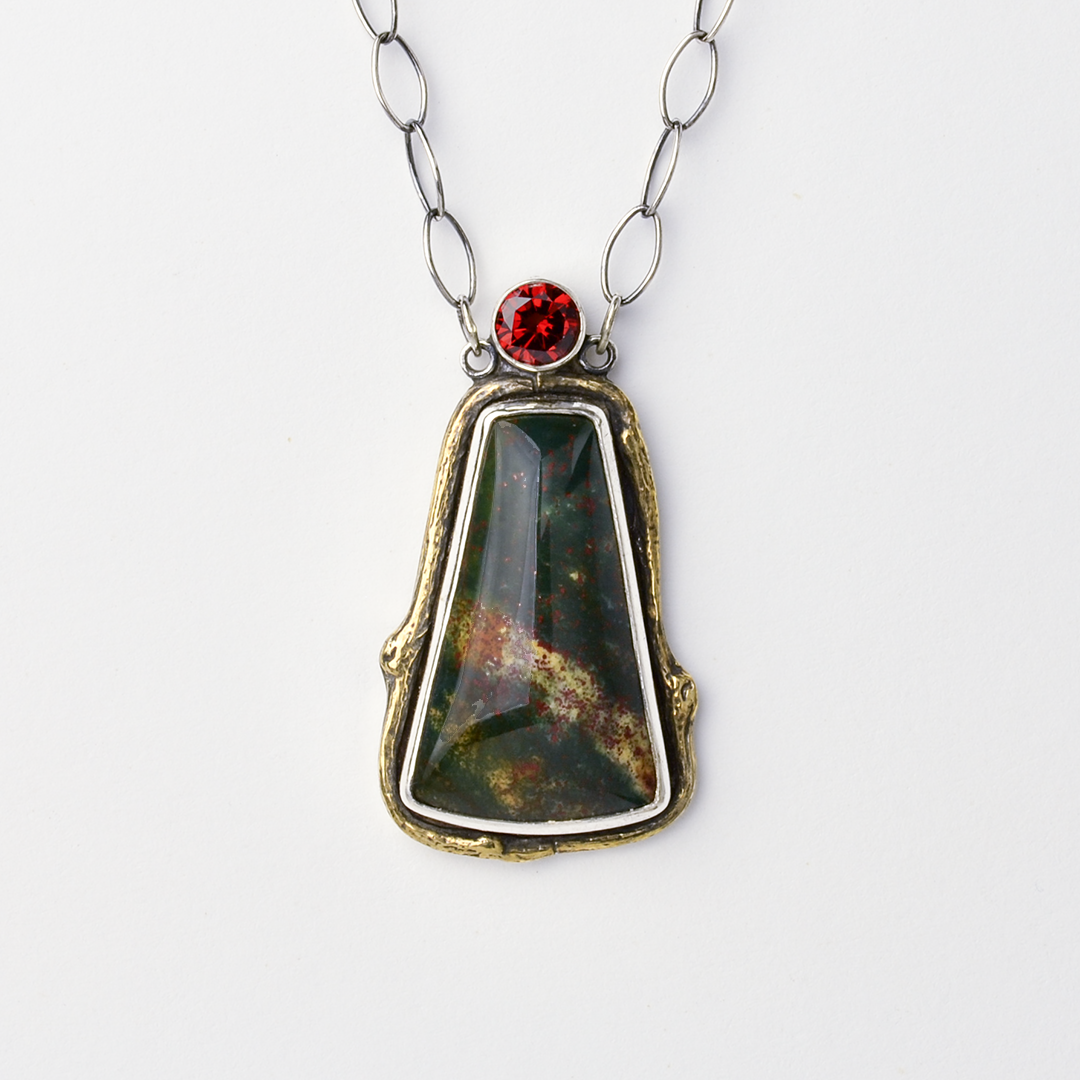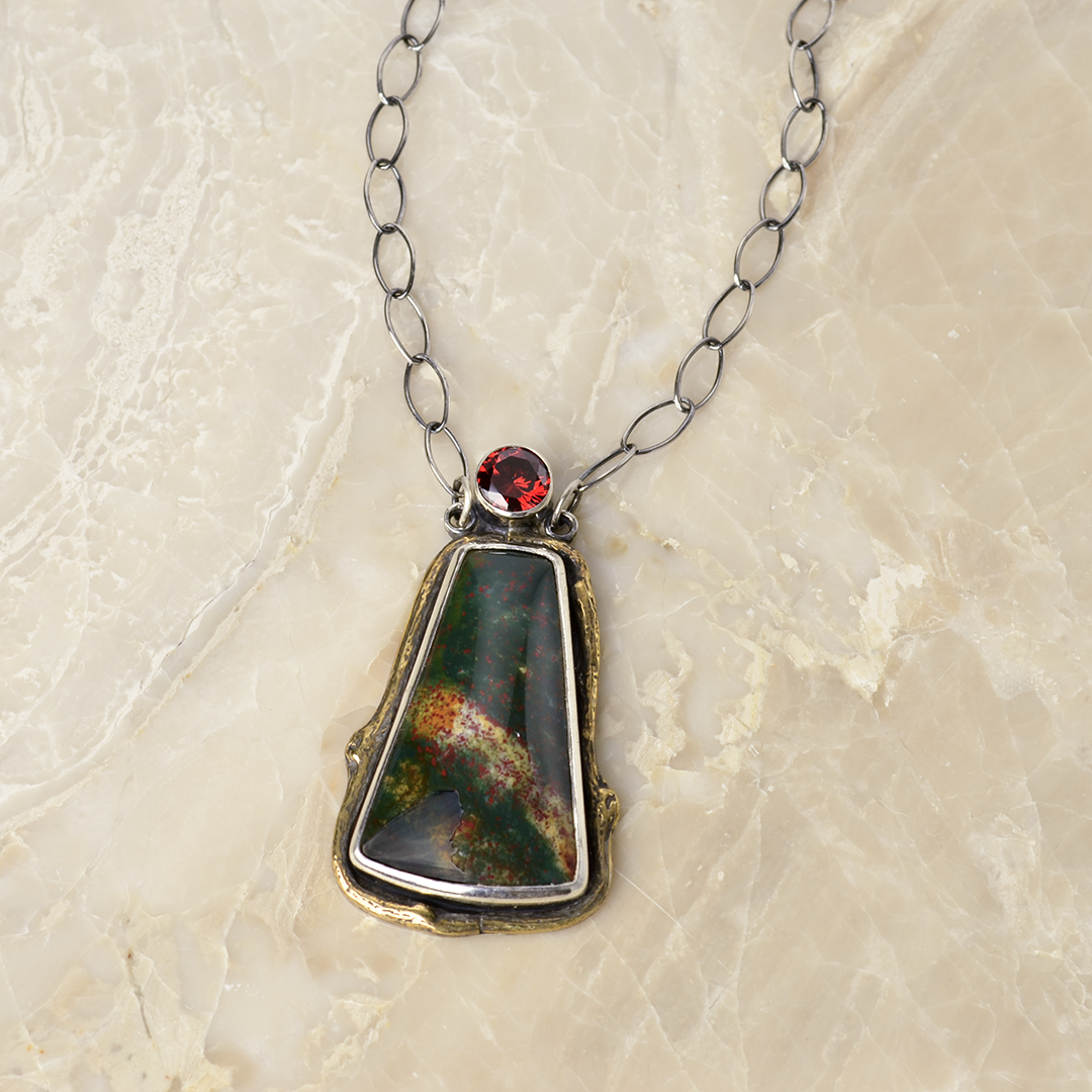 The Bloodstone pendant is made by encircling a bloodstone cabochon with a brass branch, and accented with an almandine cubic zirconia. After the soldering and polishing are complete a patina is added to enhance the wood texture and make the stone pop.
